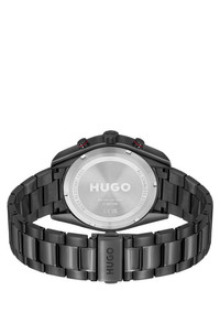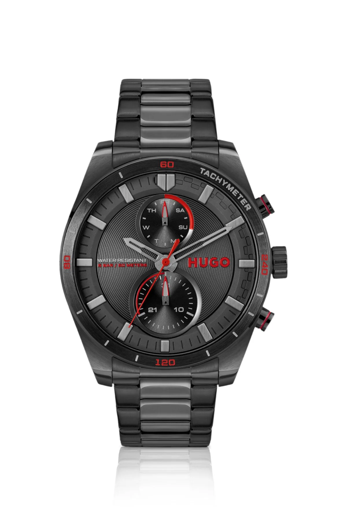 DETAILS With a checkerboard pattern and tachymeter scale, this multifunctional HUGO Menswear watch takes inspiration from the high-octane world of motorsports. Sleek, black-plated steel. #FAST - HB1530374 QUALITY & CARE INSTRUCTIONS Material: 100% Stainless steel