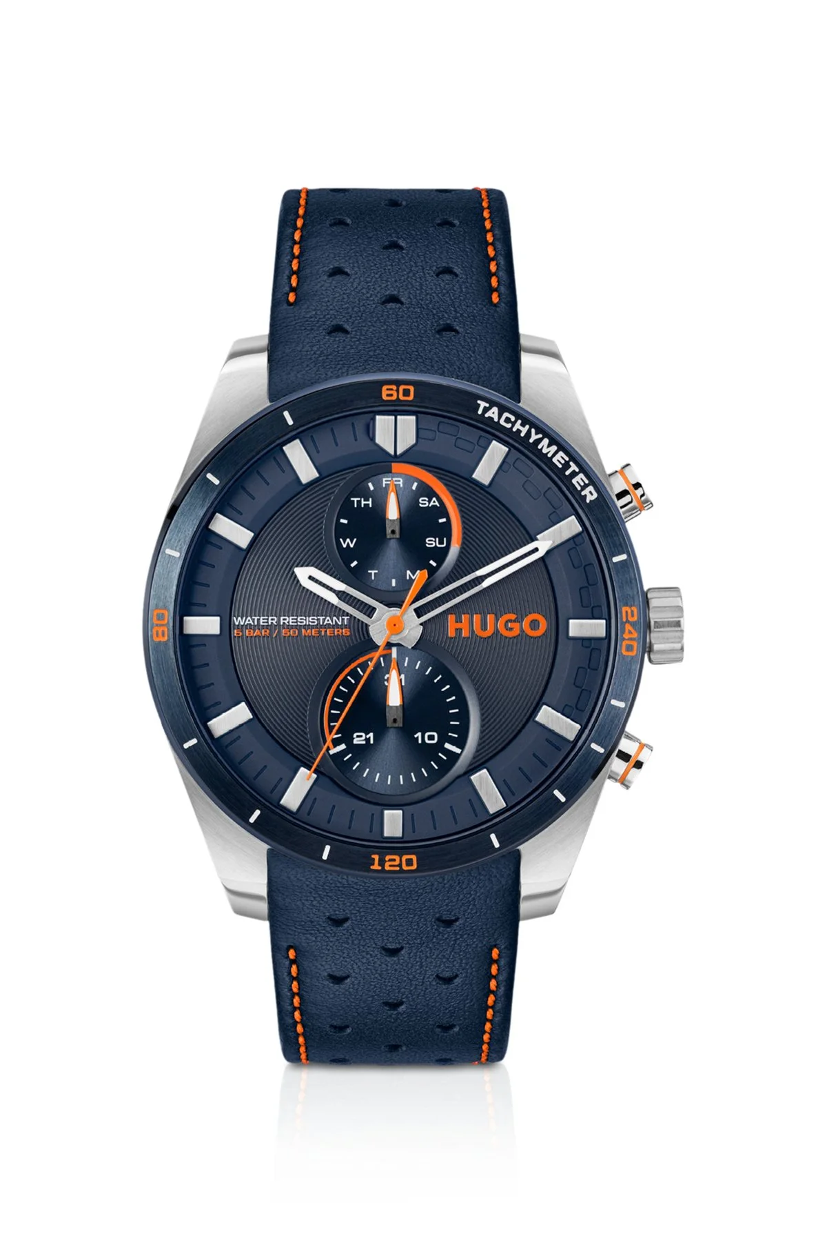 DETAILS With a blue, perforated-leather strap and checkerboard detailing, this multifunctional HUGO Menswear watch has a motorsport-inspired attitude. Bold, sculptured case. #FAST - HB1530371 QUALITY & CARE INSTRUCTIONS Material: 100% Stainless steel