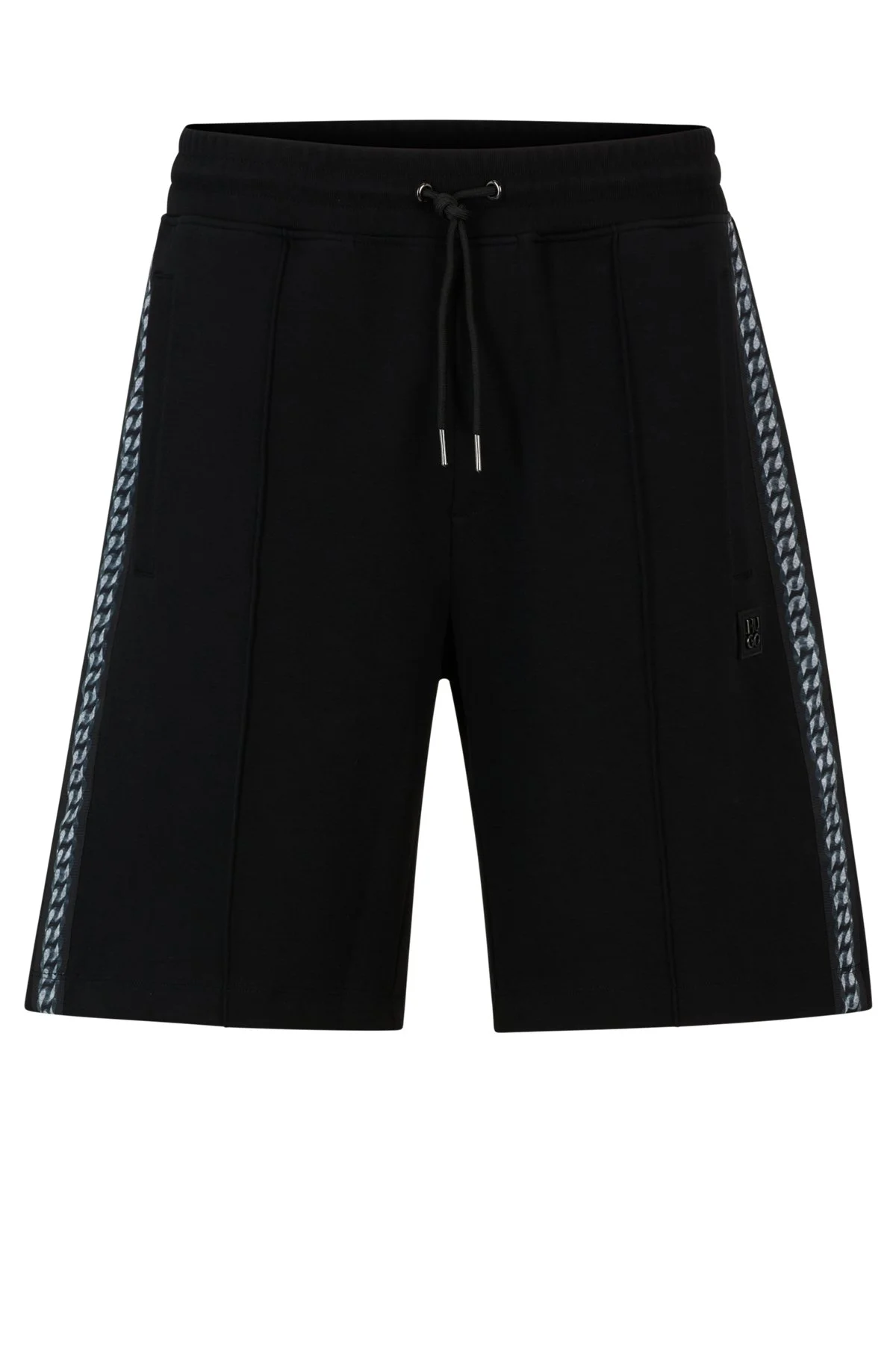 SIZE AND FIT The model wears a size M and is 6'0" tall with a, 35" chest, 27" waist and 36" hips. DETAILS Desort - 50510122 Creatively styled shorts cut to a relaxed fit in stretch cotton with chain-tape trims and a gunmetal stacked logo by HUGO Menswear. Relaxed fit QUALITY & CARE INSTRUCTIONS Do Not Bleach Do Not Tumble Dry Quality: 91% Cotton, 9% Elastane Do Not Dry Clean Iron Low Heat Machine Wash Cold Gentle