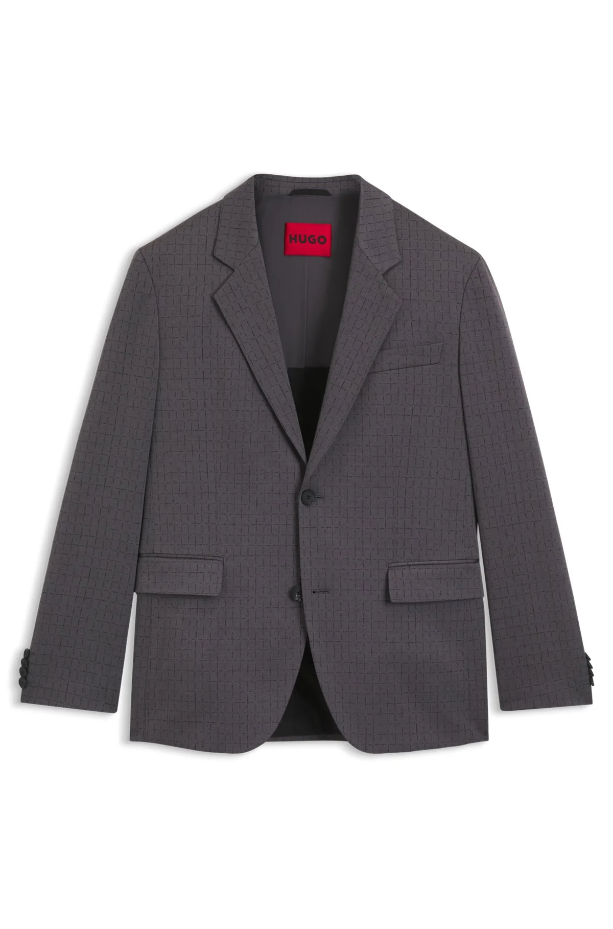 SIZE AND FIT The model wears a size 38R and is 6'2" tall with a, 38" chest, 32" waist and 38" hips. DETAILS Cut in performance-stretch fabric with a pin check, this HUGO Menswear suit jacket is a contemporary option. Blended with virgin wool. Modern fit. modern fit Notched lapels Number of buttons: 2 Welt chest pockets Pockets top: Flap pockets Inside jet pocket with button Side vent Fully lined Fit back length: 74 cm (29 inches) Karlo243X - 50557182 QUALITY & CARE INSTRUCTIONS Do Not Tumble Dry Do Not Wash Do Not Bleach Iron Low Heat Material: 48% Virgin wool, 30% Polyamid, 20% Polyester, 2% Elastane, Lining: 100% Polyester, Sleeve lining: 100% Polyester Reduced Dry Clean
