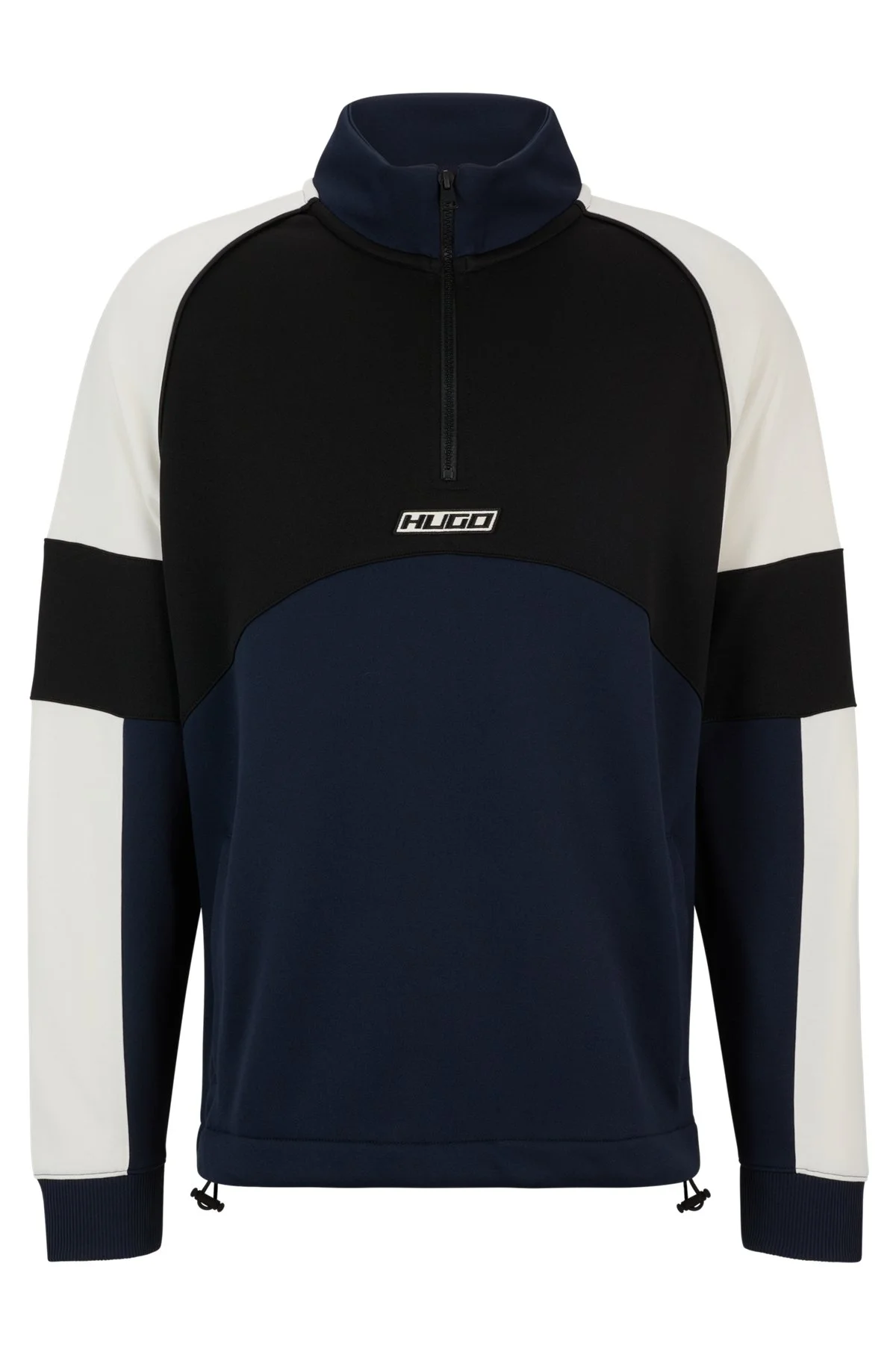 SIZE AND FIT The model wears a size M and is 6'0" tall with a, 38" chest, 30" waist and 31" hips. DETAILS Dahito - 50512969 A relaxed-fit zip-neck sweatshirt blended with cotton by HUGO Menswear with sporty color-blocking, a racing-inspired logo patch and a drawstring hem. Relaxed fit Neckline: Stand collar Fastening top: Zip closure Long sleeves Ribbed cuffs QUALITY & CARE INSTRUCTIONS Iron Low Heat Quality: 70% Polyester, 30% Cotton Machine Wash Cold Gentle Reduced Dry Clean Do Not Bleach Do Not Tumble Dry
