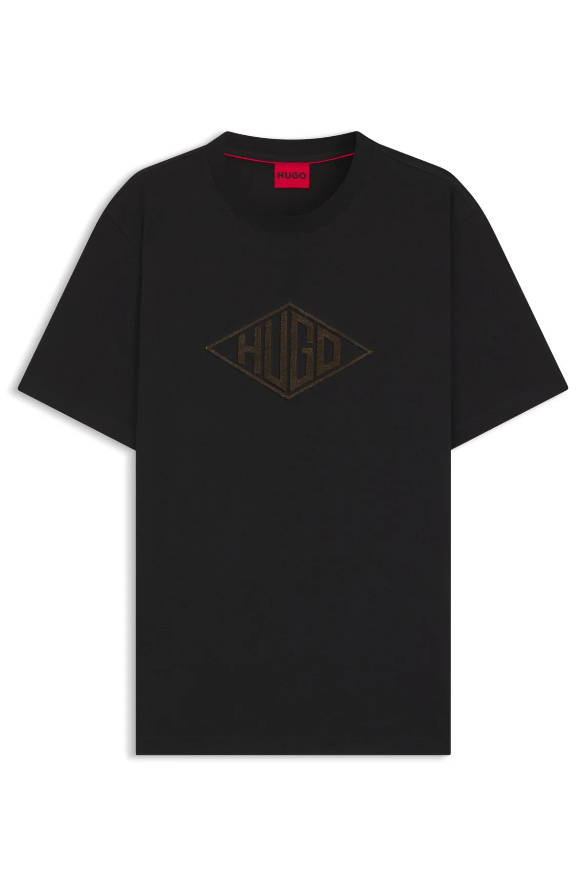 SIZE AND FIT The model wears a size M and is 6'0" tall with a, 33" chest, 27" waist and 35" hips. DETAILS Dalendi - 50534934 With its creatively embroidered 3D logo, this regular-fit HUGO Menswear T-shirt adds character to a casual look. Made in breathable cotton jersey for everyday comfort. Regular fit Neckline: Crew neck Short sleeves Standard length QUALITY & CARE INSTRUCTIONS Quality: 100% Cotton Machine Wash Cold Gentle Iron Low Heat Do Not Dry Clean Do Not Tumble Dry Do Not Bleach