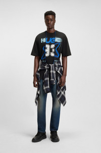 SIZE AND FIT The model wears a size L and is 6'2" tall with a, 35" chest, 27" waist and 35" hips. DETAILS Nesitis - 50544182 Make an individual statement with the mixed artwork and layered effect of this HUGO Menswear T-shirt. Crafted in soft cotton. Comfortable loose fit. loose fit Neckline: Crew neck Short sleeves QUALITY & CARE INSTRUCTIONS Do Not Tumble Dry Iron Low Heat Do Not Bleach Quality: 100% Cotton Do Not Dry Clean Machine Wash Cold Gentle