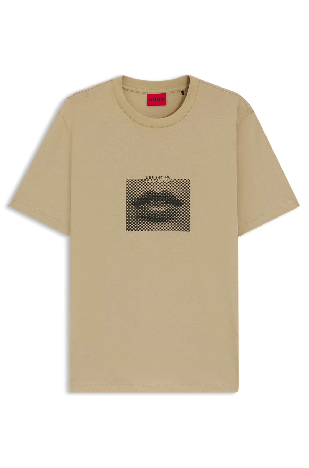 SIZE AND FIT The model wears a size M and is 6'2" tall with a, 36" chest, 28" waist and 36" hips. DETAILS Deterni - 50544496 With a statement lip graphic and split logo, this HUGO Menswear T-shirt is a fresh choice. Cut to a straight fit in soft cotton jersey. Regular fit Neckline: Crew neck Short sleeves QUALITY & CARE INSTRUCTIONS Quality: 100% Cotton Do Not Tumble Dry Do Not Bleach Machine Wash Cold Gentle Do Not Dry Clean Iron Low Heat
