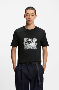 SIZE AND FIT The model wears a size M and is 6'2" tall with a, 34" chest, 29" waist and 35" hips. DETAILS Emblazoned with creative HUGO Menswear artwork, this T-shirt will breathe new life into your casuals. Straight fit. Soft cotton jersey. Regular fit Neckline: Crew neck Short sleeves Diwom - 50548565 QUALITY & CARE INSTRUCTIONS Do Not Dry Clean Do Not Tumble Dry Do Not Bleach Material: 100% Cotton Iron Low Heat Machine Wash Cold Gentle