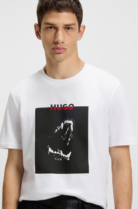 SIZE AND FIT The model wears a size M and is 6'2" tall with a, 36" chest, 28" waist and 36" hips. DETAILS Dobero - 50542734 Add impact to casual looks with the Dobermann artwork of this HUGO Menswear T-shirt. Straight fit. Soft cotton. Logo detail. Regular fit Neckline: Crew neck Short sleeves QUALITY & CARE INSTRUCTIONS Do Not Bleach Do Not Dry Clean Machine Wash Cold Gentle Iron Low Heat Do Not Tumble Dry Quality: 100% Cotton