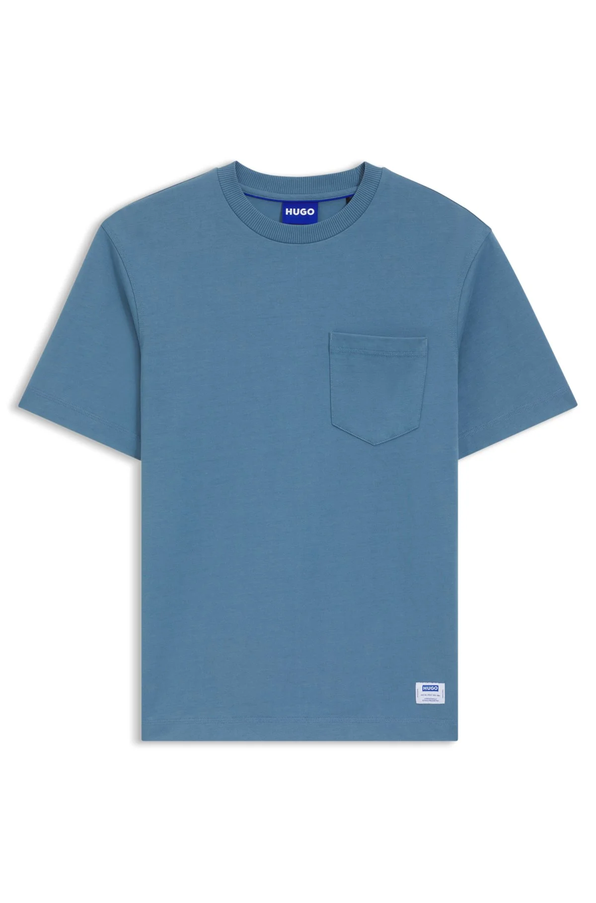 DETAILS Trimmed with a logo label and chest pocket, this HUGO Menswear T-shirt is cut in with a weighty drape. Straight fit. Regular fit Neckline: Crew neck Short sleeves Standard length Nestite - 50549108 QUALITY & CARE INSTRUCTIONS Quality: 100% Cotton, Collar: 95% Cotton, 5% Elastane Do Not Tumble Dry Iron Low Heat Machine Wash Cold Gentle Do Not Bleach Reduced Dry Clean