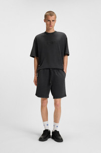 DETAILS Nebusho - 50542671 Garment dyed for a lived-in look, these HUGO Menswear cotton shorts are an easy casual choice. Straight fit with tonal logo print. Regular fit Drawstring Straight leg Pockets bottom front: Side pockets Pockets bottom back: Welt pocket QUALITY & CARE INSTRUCTIONS Do Not Dry Clean Machine Wash Cold Gentle Do Not Tumble Dry Do Not Bleach Iron Low Heat Quality: 100% Cotton