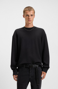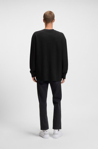 SIZE AND FIT The model wears a size M and is 6'2" tall with a, 35" chest, 27" waist and 35" hips. DETAILS Nuwolo - 50534454 With a logo-badge trim, this HUGO Menswear T-shirt is woven with a special waffle structure for textural appeal. Loose fit. Cotton rich. loose fit Neckline: Crew neck Long sleeves QUALITY & CARE INSTRUCTIONS Do Not Tumble Dry Machine Wash Cold Gentle Quality: 87% Cotton, 13% Polyamid Reduced Dry Clean Iron Low Heat Do Not Bleach
