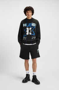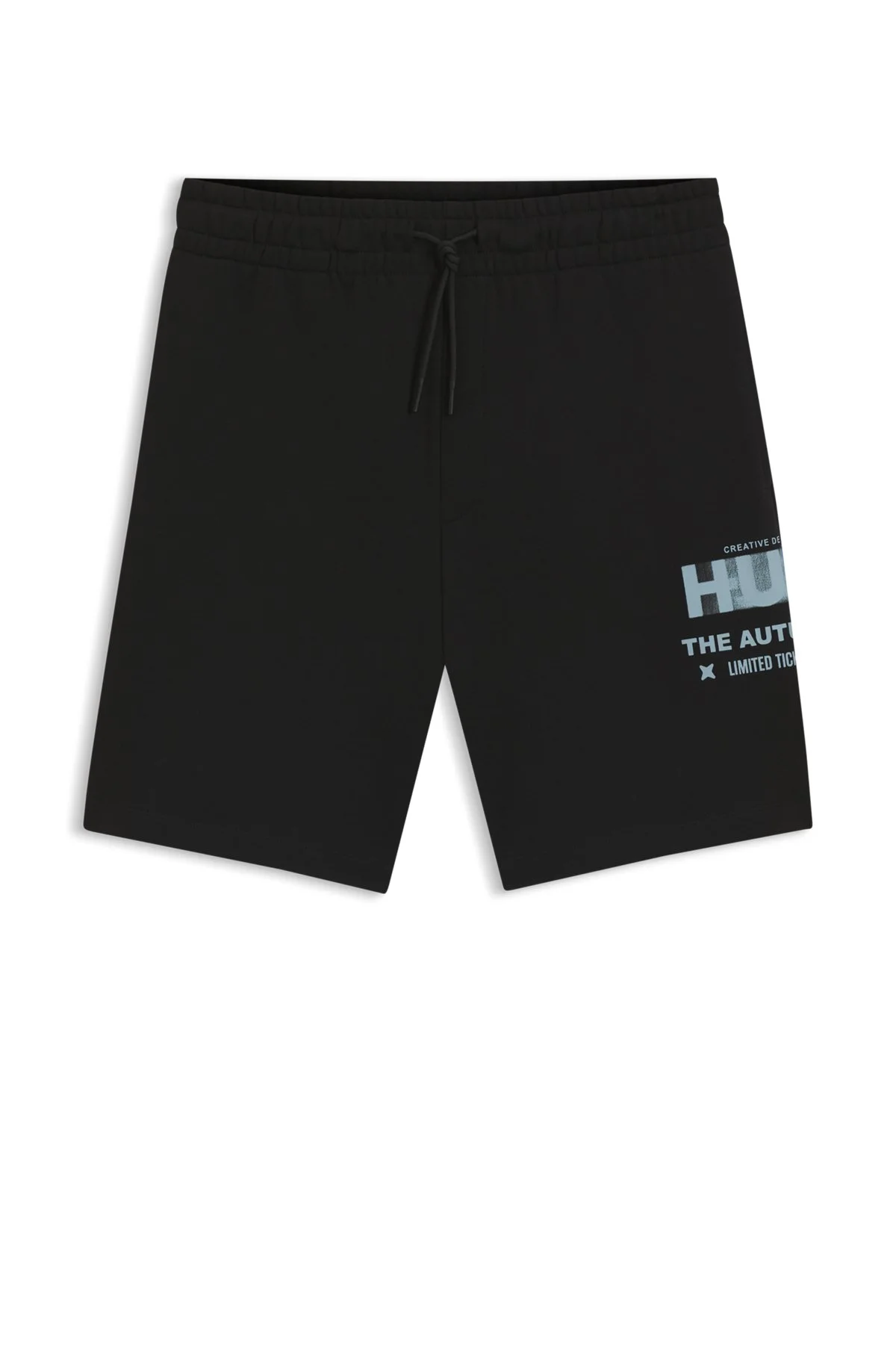SIZE AND FIT The model wears a size M and is 6'0" tall with a, 35" chest, 27" waist and 35" hips. DETAILS Nesisho - 50544198 With statement artwork and branding in mixed effects, these HUGO Menswear shorts add impact to casual moments. Loose fit in comfortable French-terry cotton. loose fit QUALITY & CARE INSTRUCTIONS Do Not Tumble Dry Machine Wash Cold Gentle Quality: 100% Cotton Iron Low Heat Do Not Bleach Do Not Dry Clean
