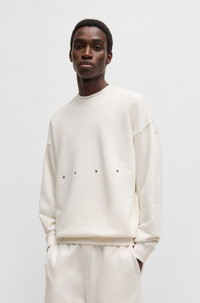 SIZE AND FIT The model wears a size M and is 6'0" tall with a, 33" chest, 27" waist and 33" hips. DETAILS Dutap - 50538973 In a roomy fit for casual layering, this HUGO Menswear sweatshirt has fresh artwork front and back. Crafted in comfortable cotton terry. Oversized fit Neckline: Crew neck Long sleeves Ribbed cuffs QUALITY & CARE INSTRUCTIONS Do Not Dry Clean Machine Wash Cold Gentle Iron Low Heat Do Not Tumble Dry Quality: 100% Cotton Do Not Bleach