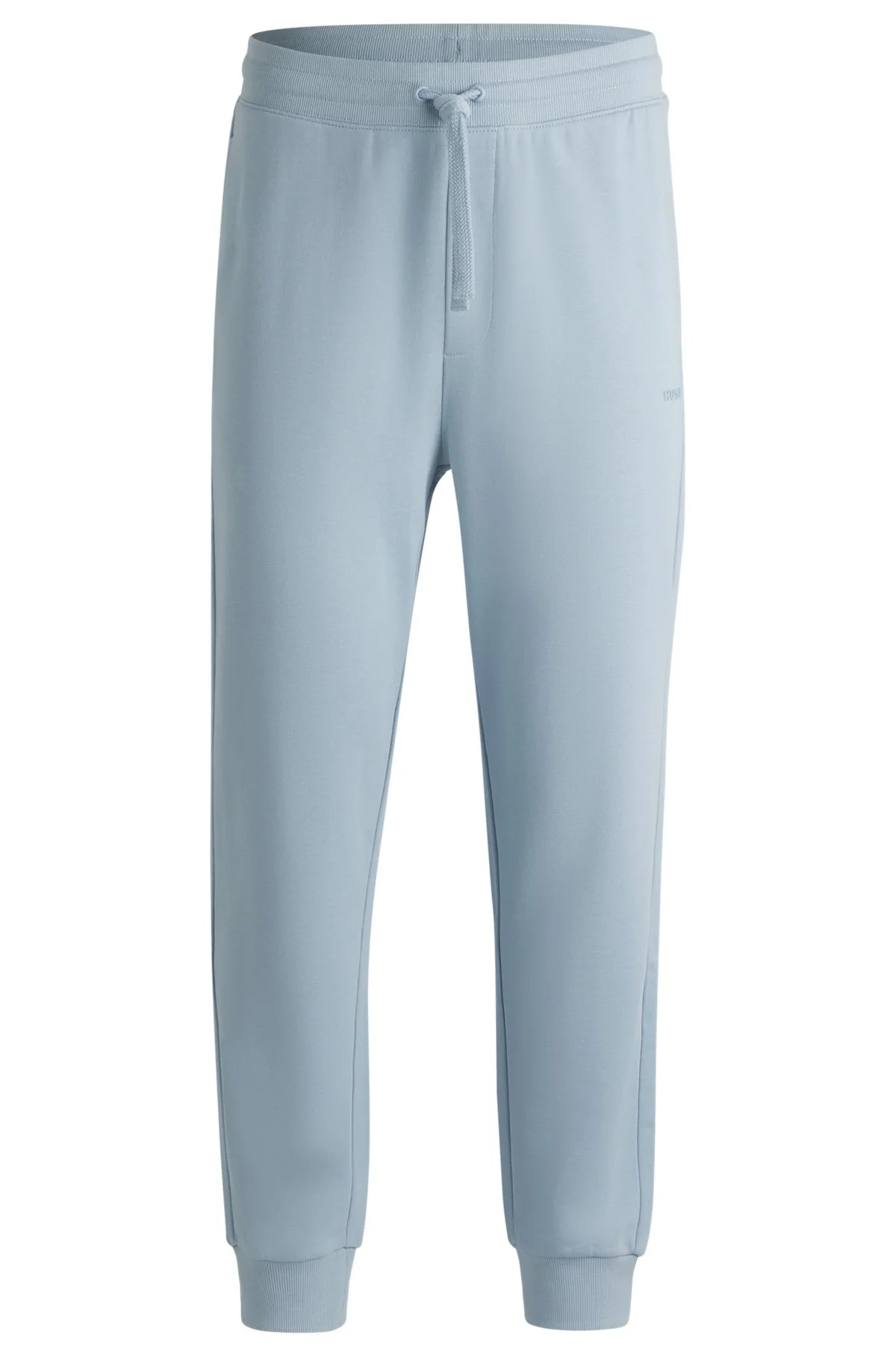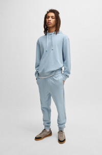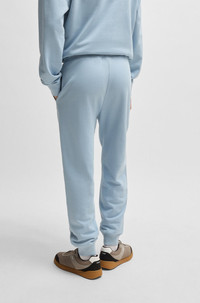 SIZE AND FIT The model wears a size M and is 6'1" tall with a, 33" chest, 25" waist and 35" hips. DETAILS Dayote232 - 50489617 Cuffed tracksuit bottoms in a straight fit by HUGO Menswear. This regular-rise pair is crafted in cotton terry with a contrast logo print. Regular fit Regular rise Elastic Waistband Pockets bottom front: Side pockets QUALITY & CARE INSTRUCTIONS Iron Low Heat Machine Wash Cold Gentle Quality: 100% Cotton Do Not Bleach Do Not Tumble Dry Do Not Dry Clean