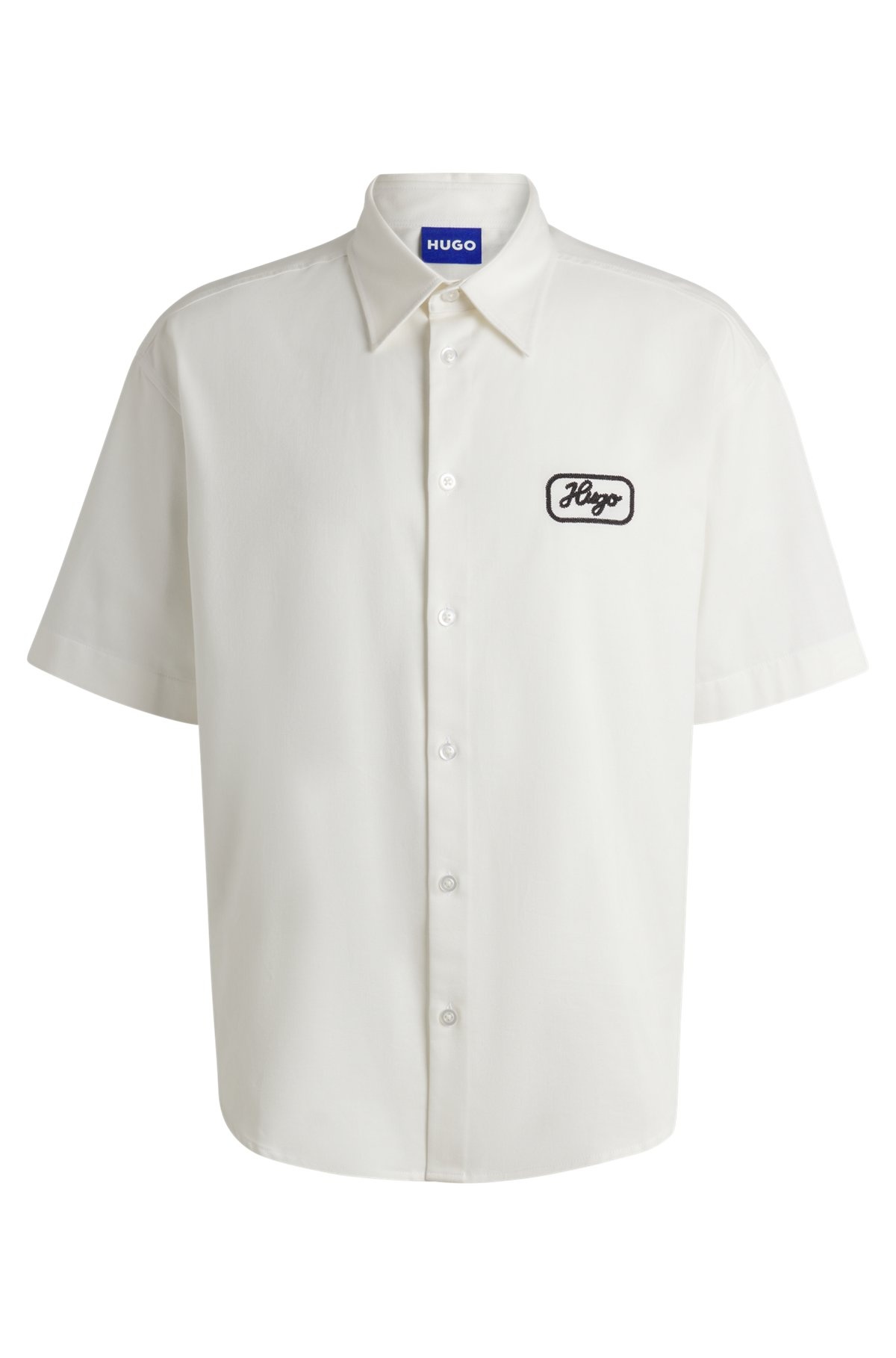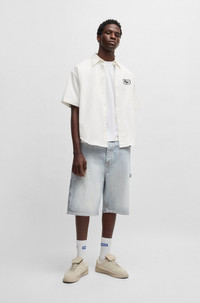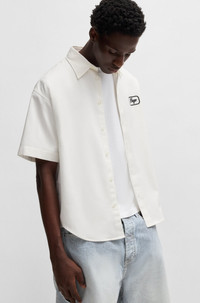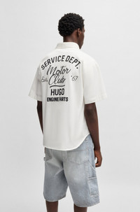 SIZE AND FIT The model wears a size M and is 6'1" tall with a, 32" chest, 27" waist and 33" hips. DETAILS Ebronn - 50539100 In cotton twill for everyday comfort, this HUGO Menswear shirt is makes a casual statement. Garage workshirt-inspired graphics embroidered front and back. Relaxed fit Kent collar Standard length Fit back length: 78 cm (31 inches) QUALITY & CARE INSTRUCTIONS Do Not Tumble Dry Iron Low Heat Quality: 100% Cotton, Embroidery: 100% Polyester Do Not Bleach Machine Wash Cold Do Not Dry Clean