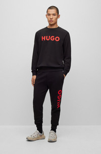SIZE AND FIT The model wears a size M and is 6'2" tall with a, 37" chest, 29" waist and 38" hips. DETAILS Dutschi - 50473211 Cuffed tracksuit bottoms by HUGO Menswear, cut to a straight fit in French terry with a large contrast logo on the left leg. Regular fit Regular rise Elastic Waistband QUALITY & CARE INSTRUCTIONS Do Not Bleach Do Not Tumble Dry Quality: 100% Cotton Do Not Dry Clean Iron Low Heat Machine Wash Cold Gentle