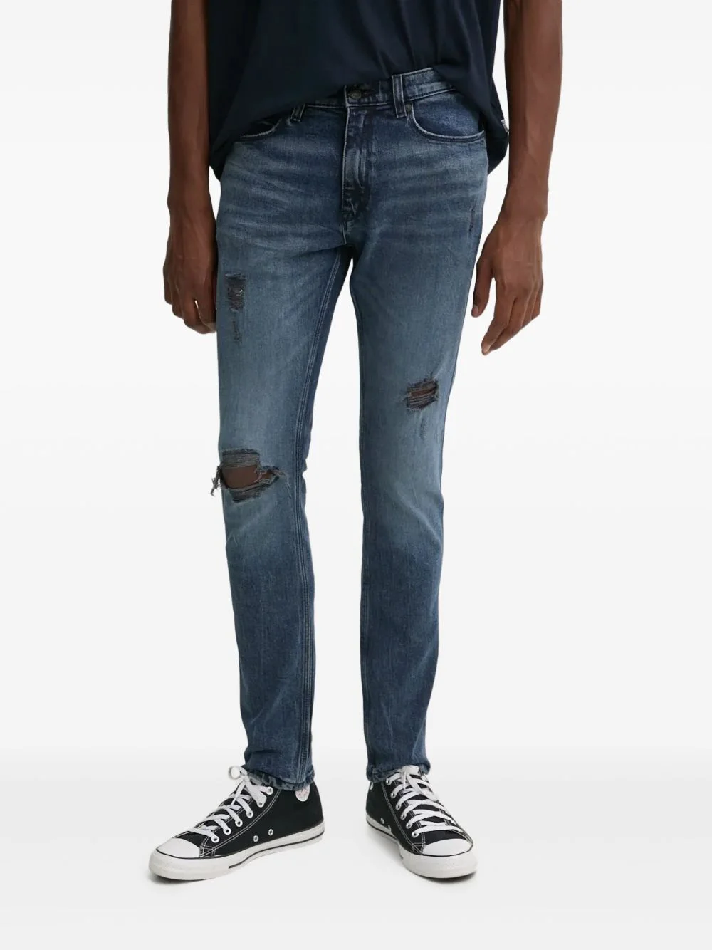 distressed five-pockets jeans Highlights - Blue - Distressed detailing - Five pockets - Belt loops - Rear logo patch Imported Composition Fabric 100%