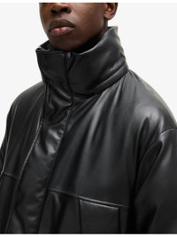 PRODUCT DETAILS - HUGO faux leather-down jacket - 100% faux leather; lining 100% polyester; filling 80% duck down, 20% duck feather - Zip fastening - Regular fit, hood with embossed logo, long sleeves, pockets at front, longline, padded, smooth finish - Specialist leather clean - Model is 6ft 2in/1.88m and wears a size medium - Heavyweight, non-stretch Ref: R04284018