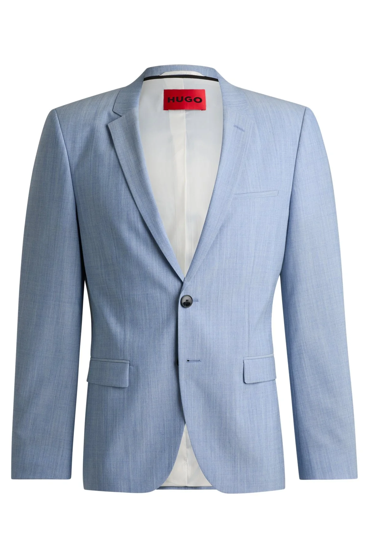 SIZE AND FIT The model wears a size 40R and is 6'1" tall with a, 32" chest, 27" waist and 33" hips. DETAILS Arti232X - 50540280 With its melange effect, this extra-slim-fitting HUGO Menswear blazer is so easy to style. Performance-stretch cloth offers flexible comfort and wrinkle resistance. Extra-slim fit Notched lapels Number of buttons: 2 Welt chest pockets Pockets top: Flap pockets Button cuffs Side vent Fully lined Fit back length: 72 cm (28 inches) QUALITY & CARE INSTRUCTIONS Do Not Tumble Dry Do Not Bleach Do Not Wash Quality: 58% Virgin wool, 41% Polyester, 1% Elastane, Lining: 100% Polyester, Sleeve lining: 100% Polyester Reduced Dry Clean Iron Low Heat