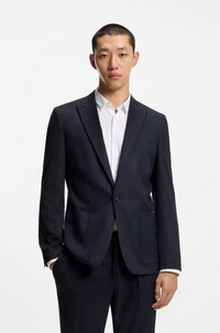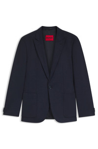 DETAILS Tailored to an extra-slim profile, this HUGO Menswear blazer is crafted in stretch flannel with performance properties including temperature regulation. Blended with soft wool. Extra-slim fit Peaked lapels Number of buttons: 1 Pockets top: Patch pockets Inside jet pockets Side vent Fully lined Fit back length: 73 cm (29 inches) Arti253F1X - 50547500 QUALITY & CARE INSTRUCTIONS Do Not Wash Do Not Bleach Quality: 51% Polyester, 24% Viscose, 22% Wool, 3% Elastane, Lining: 100% Polyester, Sleeve lining: 100% Polyester Reduced Dry Clean Iron Low Heat Do Not Tumble Dry