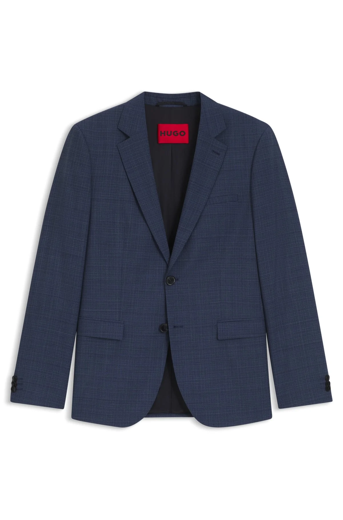 DETAILS Arti253X - 50546657 With a mouline finish for easy styling, this HUGO Menswear suit jacket has an extra-slim silhouette. Virgin wool with natural stretch for comfort. Extra-slim fit Notched lapels Number of buttons: 2 Welt chest pockets Inside jet pocket with button Side vent Fully lined Fit back length: 72 cm (28 inches) QUALITY & CARE INSTRUCTIONS Do Not Wash Iron Medium Heat Reduced Dry Clean Do Not Tumble Dry Quality: 100% Virgin wool, Lining: 100% Viscose, Sleeve lining: 100% Viscose Do Not Bleach