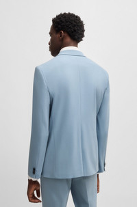 SIZE AND FIT The model wears a size 40R and is 6'1" tall with a, 32" chest, 27" waist and 33" hips. DETAILS Arti243F2X - 50538273 With super-flex performance, this extra-slim-fit HUGO Menswear blazer will move with you throughout your day. Crafted in poplin that's ideal for summer. Extra-slim fit Peaked lapels Number of buttons: 2 Pockets top: Flap pockets Inside jet pocket with button Back vent Fully lined Fit back length: 73 cm (29 inches) QUALITY & CARE INSTRUCTIONS Iron Low Heat Do Not Wash Do Not Bleach Reduced Dry Clean Do Not Tumble Dry Quality: 51% Wool, 44% Polyester, 5% Elastane, Lining: 100% Polyester, Sleeve lining: 100% Polyester