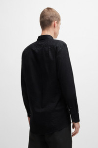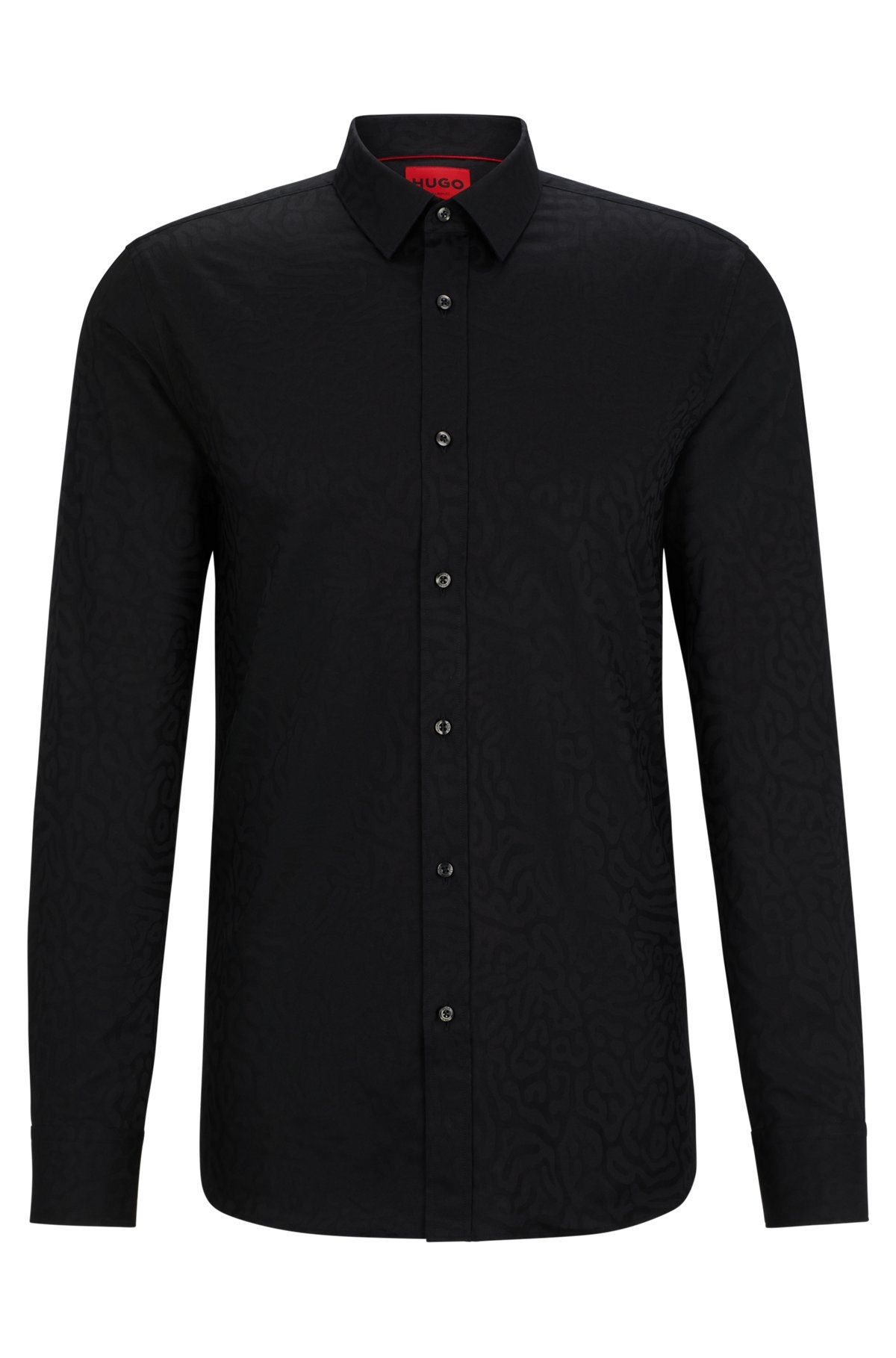 SIZE AND FIT The model wears a size EU:40 and is 6'2" tall with a, 35" chest, 27" waist and 35" hips. DETAILS Elisha02 - 50519824 A modern shirt in cotton featuring an animal-pattern jacquard by HUGO Menswear. This piece is tailored to an extra-slim silhouette. Extra-slim fit Kent collar Angled cuffs Standard length QUALITY & CARE INSTRUCTIONS Do Not Bleach Do Not Tumble Dry Machine Wash Cold Quality: 100% Cotton Do Not Dry Clean Iron Low Heat