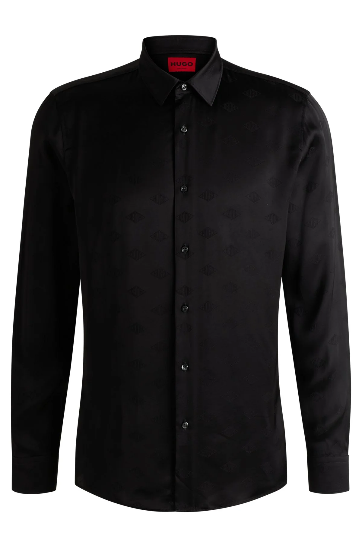 SIZE AND FIT The model wears a size 15.5 and is 6'1" tall with a, 36" chest, 29" waist and 36" hips. DETAILS Elisha02 - 50539726 The ultra-sleek lines of this HUGO Menswear shirt deliver a sharp profile. The soft fabric is patterned with geometric logos for an expressive touch. Extra-slim fit Kent collar Angled cuffs Standard length QUALITY & CARE INSTRUCTIONS Do Not Dry Clean Machine Wash Cold Do Not Bleach Iron Low Heat Quality: 100% Viscose Do Not Tumble Dry