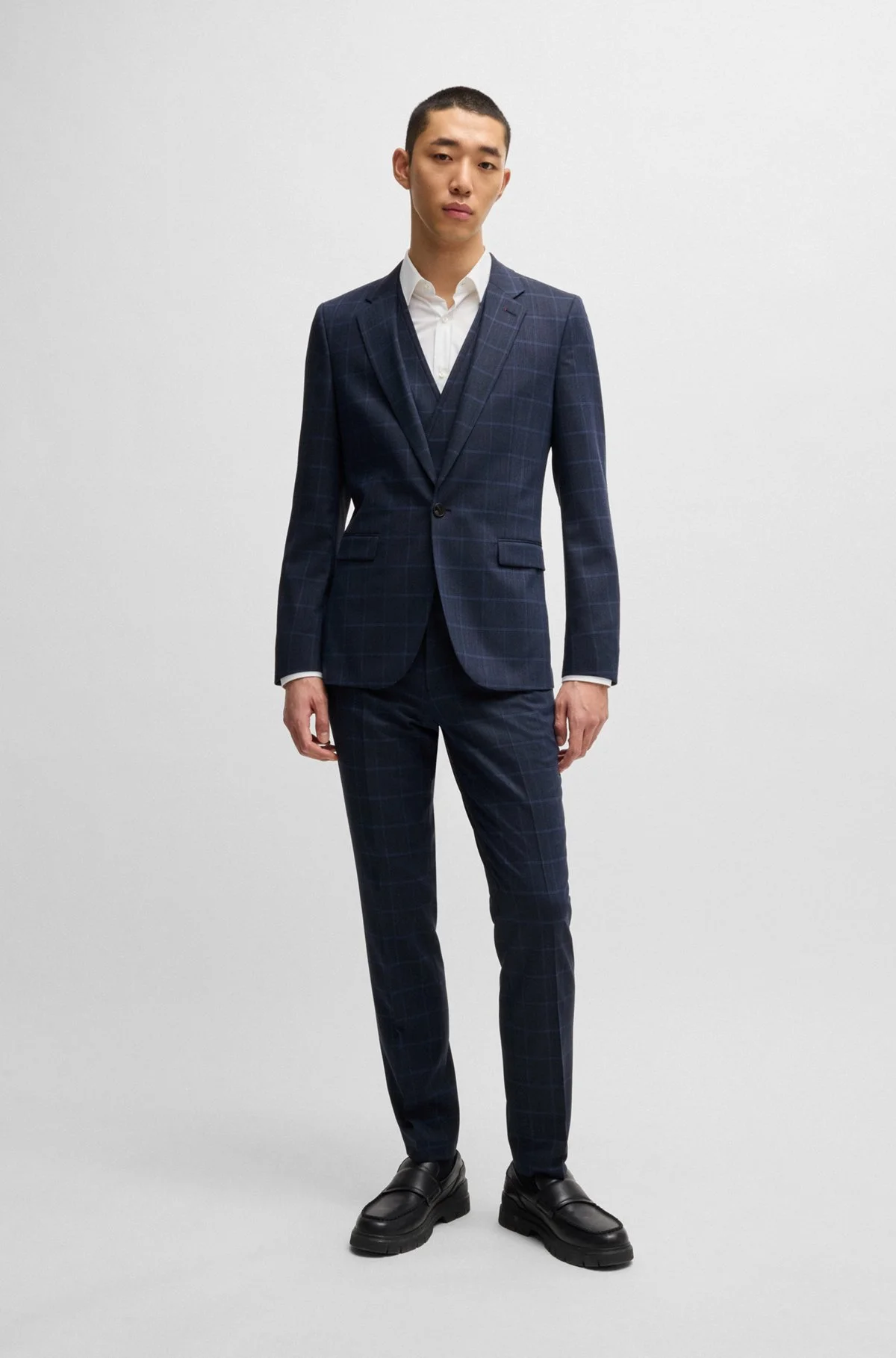 SIZE AND FIT The model wears a size 38R and is 6'2" tall with a, 34" chest, 29" waist and 35" hips. DETAILS Arti/Hesten242V1X - 50535440 A versatile suit in an extra-slim fit by HUGO Menswear. This ensemble is crafted in checked performance-stretch cloth blended with wool. Extra-slim fit Notched lapels Fastening top: Button closure Number of buttons: 1 Pockets top: Flap pockets Inside welt pockets Button cuffs Side vent Fully lined Standard length Fit back length: 73 cm (29 inches) Hook and zip closure Pockets bottom front: Side pockets Pockets bottom back: Welt pocket Fit foot width: 34,0 cm (13.4 inches) Packaging: Dust bag QUALITY & CARE INSTRUCTIONS Iron Low Heat Do Not Wash Quality: 42% Virgin wool, 34% Viscose, 23% Polyester, 1% Elastane, Lining: 100% Viscose, Sleeve lining: 100% Viscose, pocketing: 65% Polyester, 35% Cotton, knee lining: 100% Viscose Reduced Dry Clean Do Not Bleach Do Not Tumble Dry