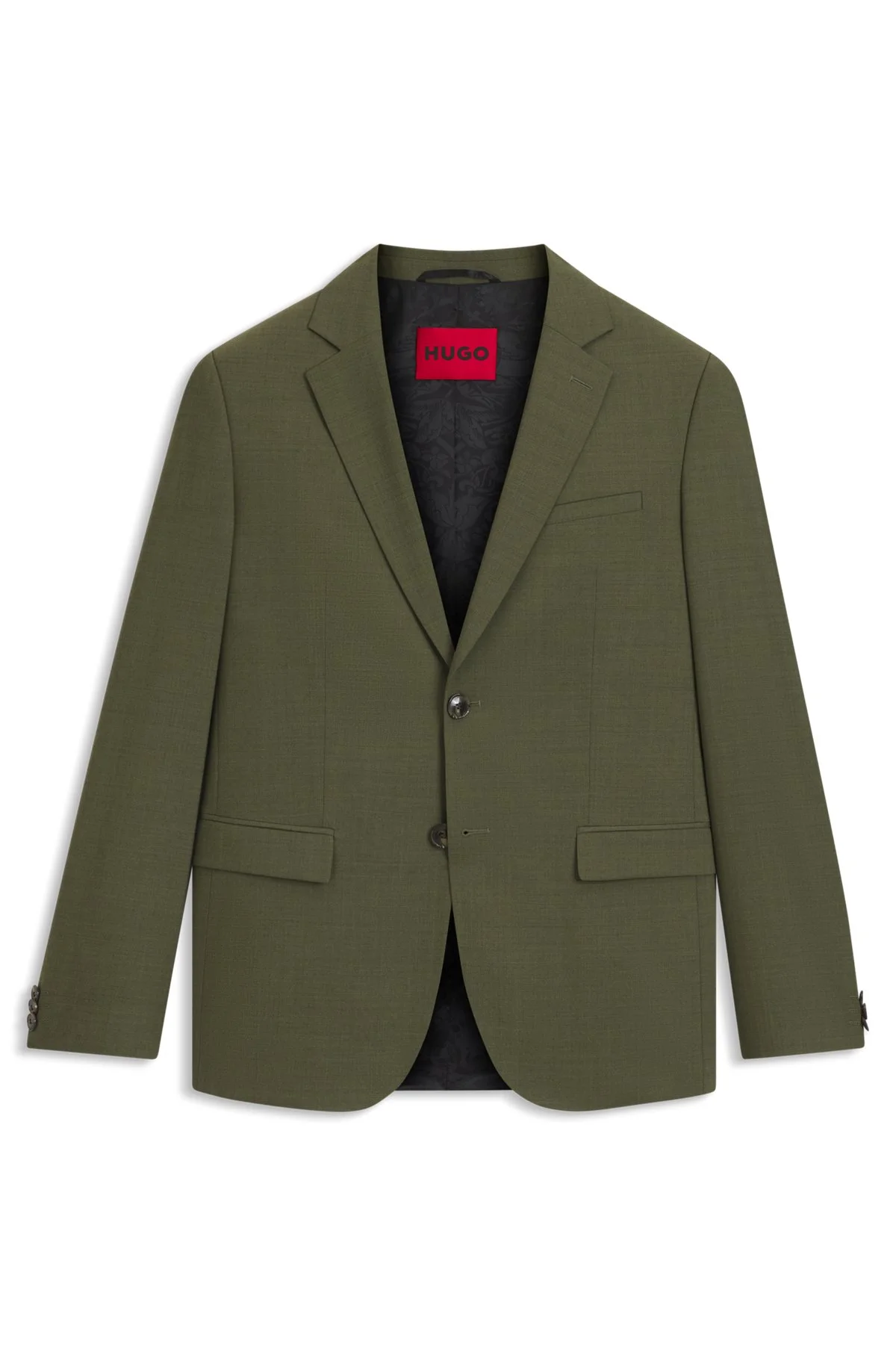 SIZE AND FIT The model wears a size 38R and is 6'2" tall with a, 34" chest, 27" waist and 36" hips. DETAILS Arti253X - 50544715 With an easy-to-style texture, this HUGO Menswear suit jacket is crafted in flexible dobby cloth with wool. Sharp ultra-slim fit. Extra-slim fit Notched lapels Number of buttons: 2 Welt chest pockets Inside jet pocket with button Side vent Fully lined Fit back length: 72 cm (28 inches) QUALITY & CARE INSTRUCTIONS Do Not Tumble Dry Quality: 54% Polyester, 44% Virgin wool, 2% Elastane, Lining: 100% Polyester, Sleeve lining: 100% Polyester Reduced Dry Clean Iron Low Heat Do Not Wash Do Not Bleach