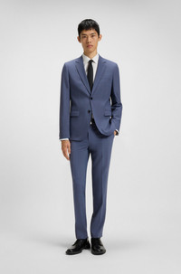 DETAILS Hesten253X - 50544734 In textured dobby blended with wool, these HUGO Menswear trousers have generous stretch for adaptable comfort. Modern super-slim fit. Extra-slim fit Fit foot width: 36,0 cm (14.2 inches) QUALITY & CARE INSTRUCTIONS Reduced Dry Clean Do Not Bleach Do Not Tumble Dry Quality: 54% Polyester, 44% Virgin wool, 2% Elastane, pocketing: 65% Polyester, 35% Cotton, knee lining: 100% Viscose Do Not Wash Iron Low Heat