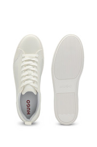 DETAILS Morrie_Tenn_mono_N - 50541696 Patterned with subtle monograms, these HUGO Menswear cupsole trainers are made in synthetic coated fabric. Supportive and durable rubber outsole. Pull-loops. Synthetic coated fabric, sometimes referred to as faux leather, is a fabric designed to resemble real leather, and/or display a matte, glossy, smooth, or textured, coated appearance. Laces Fully lined Packaging: Box QUALITY & CARE INSTRUCTIONS Upper material: 60% Polyester, 40% Polyurethane, Lining: 100% Polyester, 60% Polyester, 40% Polyurethane, Sole: 100% Rubber, Innersole: 100% Polyester