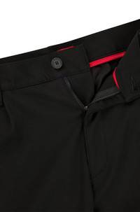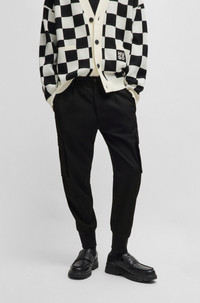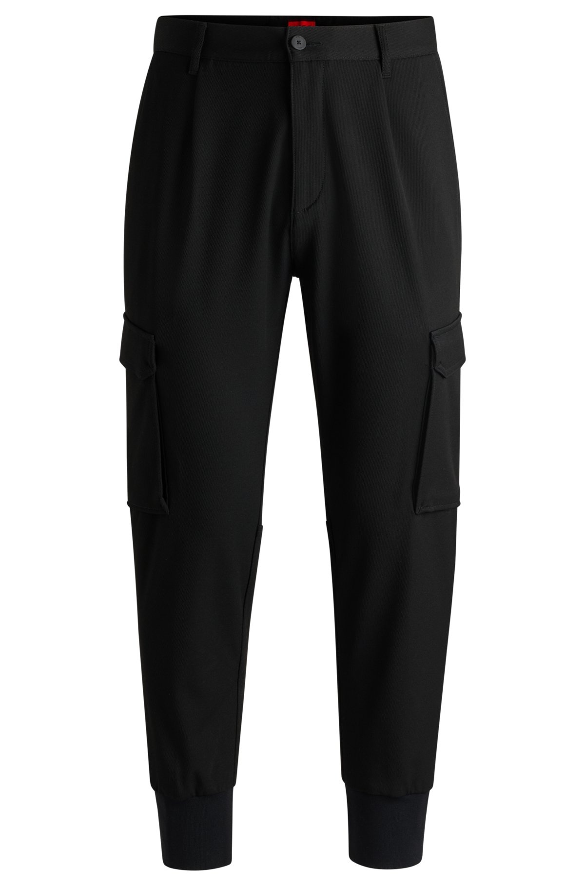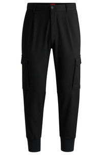 SIZE AND FIT The model wears a size 32R and is 6'1" tall with a, 34" chest, 26" waist and 35" hips. DETAILS Glavin241 - 50505856 Trend-driven trousers by HUGO Menswear, cut to a slim fit with a tapered leg in stretch gabardine with pintuck pleats and cargo pockets. Tapered fit Regular rise Button and zip closure Elastic Waistband Tapered leg Pleat front Pockets bottom front: Side slash pockets Pockets bottom back: Welt pocket QUALITY & CARE INSTRUCTIONS Quality: 68% Polyester, 28% Viscose, 4% Elastane, pocketing: 65% Polyester, 35% Cotton Do Not Tumble Dry Do Not Bleach Machine Wash Cold Gentle Iron Low Heat Reduced Dry Clean