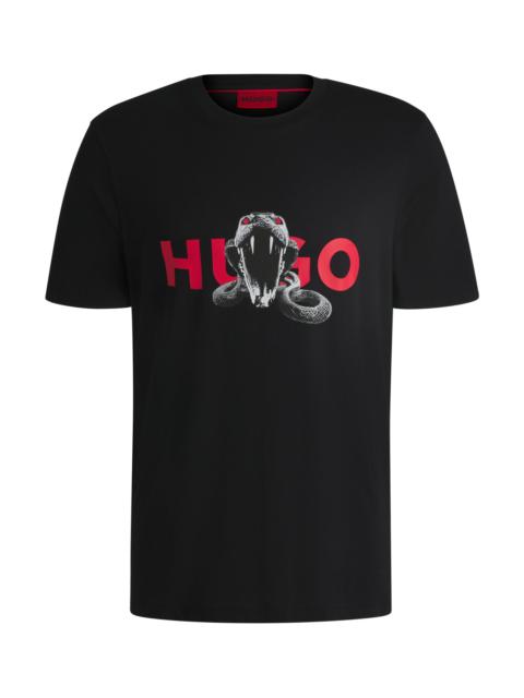 SIZE AND FIT The model wears a size M and is 6'1" tall with a, 33" chest, 25" waist and 35" hips. DETAILS Deyladec - 50530607 A statement T-shirt crafted in cotton jersey by HUGO Menswear. This oversize-fit top is printed with an animal graphic and HUGO branding. Regular fit Neckline: Crew neck Short sleeves QUALITY & CARE INSTRUCTIONS Iron Low Heat Machine Wash Cold Gentle Quality: 100% Cotton Do Not Bleach Do Not Tumble Dry Do Not Dry Clean