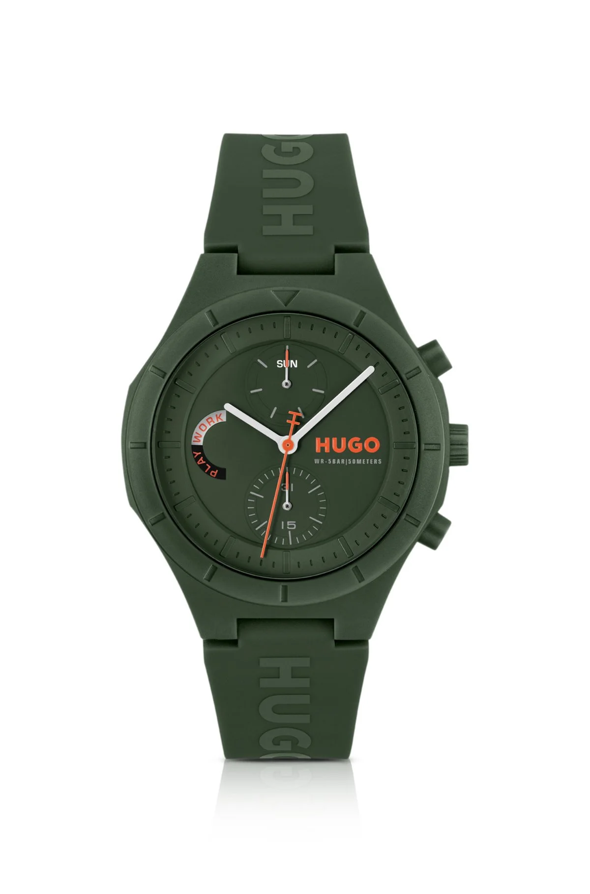 DETAILS #LIT MULTI - 58244992 Brimming with HUGO Menswear DNA, this watch has an all-green palette with contrast pops. Matte dial with playful subeye and 'H' sweep tip. Watch mechanism: multi-eye Dial color: green Strap material: Silicone Closure: HUGO buckle Case size: 1.73 in (44 mm) (0 inches) Water Resistance (in ATM): 5 ATM QUALITY & CARE INSTRUCTIONS Quality: 80% Plastic, 20% Silicone
