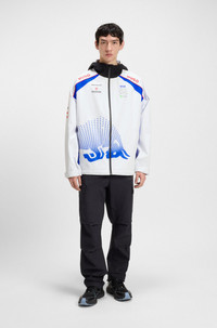 DETAILS J_Rain-VCARB25 - 50549097 With bull graphics and a contrast hood, this men's HUGO x VCARB jacket is packed with statement style. Water repellent. Laid-back fit. Adjustable hem. Celebrate the thrill of motorsports with this unique product from the high-octane collaboration between HUGO and the Visa Cash App Racing Bulls Formula One™ Team. Relaxed fit Stand collar Stand collar Fastening top: Zip closure Pockets top: Zip pockets Inside zip pockets Elasticized cuffs Fully lined Standard length Fit back length: 67 cm (26 inches) QUALITY & CARE INSTRUCTIONS Do Not Wash Do Not Iron very mild professional wet clean Do Not Bleach Do Not Tumble Dry Quality: 74% Polyamid, 26% Elastane, pocketing: 100% Polyester Do Not Dry Clean