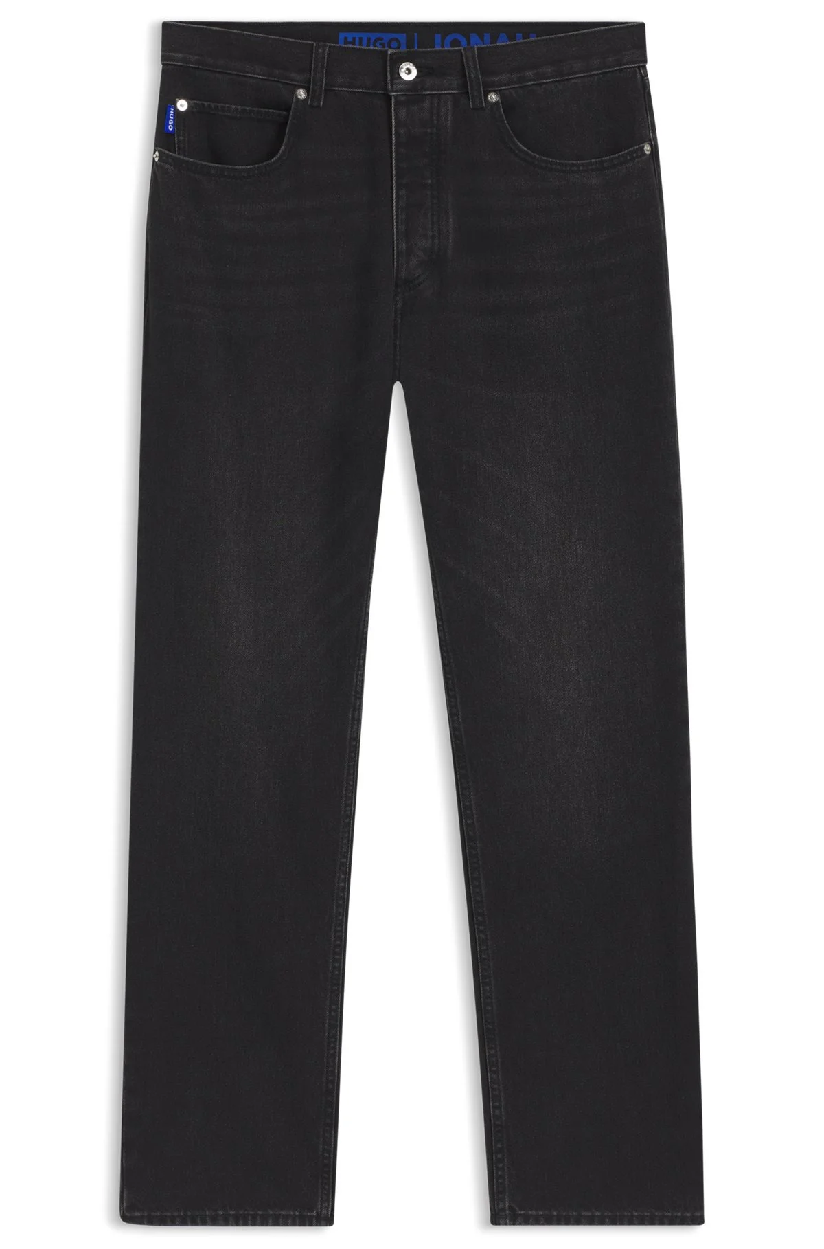 SIZE AND FIT The model wears a size 32/32 and is 6'0" tall with a, 33" chest, 27" waist and 35" hips. DETAILS Jonah - 50511507 Versatile jeans by HUGO Menswear. This straight-fit pair, with a regular-rise waist, comes in weighty cotton denim featuring a dark-gray wash. Regular fit Regular rise Button and zip closure Pockets bottom front: Side pockets Straight leg Pockets bottom back: Patch pocket Standard length Fit foot width: 40,0 cm (15.7 inches) QUALITY & CARE INSTRUCTIONS Quality: 100% Cotton, pocketing: 100% Cotton Iron Medium Heat Do Not Bleach Do Not Tumble Dry Machine Wash Cold Gentle Do Not Dry Clean