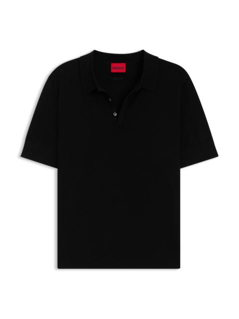 SIZE AND FIT The model wears a size M and is 6'0" tall with a, 33" chest, 27" waist and 35" hips. DETAILS San Peter-CV - 50536672 In a straight fit, this HUGO Menswear knit polo is a modern, versatile layer. Concealed placket for a minimalist look. Rear intarsia logo. Regular fit Neckline: Polo collar Short sleeves QUALITY & CARE INSTRUCTIONS Machine Wash Cold Gentle Do Not Dry Clean Do Not Tumble Dry Quality: 72% Viscose, 28% Polyester Do Not Bleach Iron Low Heat
