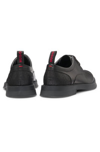 DETAILS Lenner_derb_stmn - 50548553 Featuring monograms on the heel, these HUGO Menswear Derby shoes take a modern approach to a business classic. Soft leather with logo pull loop. Sole: Other material Fully lined Laces Packaging: Box QUALITY & CARE INSTRUCTIONS Upper material: 100% Cow leather, Lining: 100% Polyester, 60% Polyester, 40% Polyurethane, Sole: 100% Rubber, Innersole: 60% Polyester, 40% Polyurethane