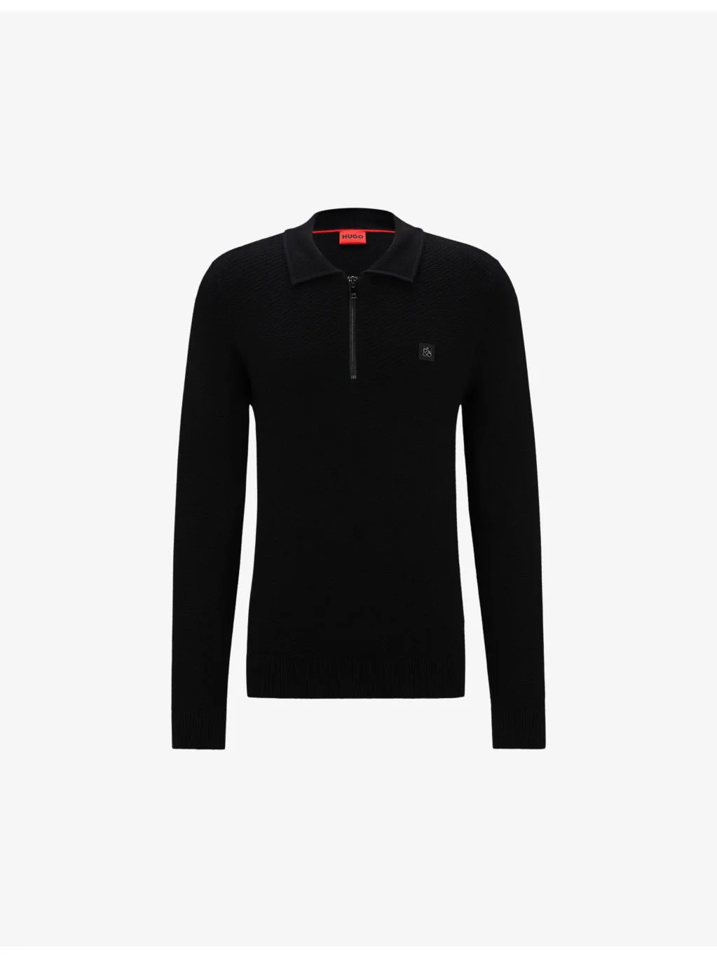 PRODUCT DETAILS - HUGO knitted jumper - 40% viscose, 30% polyamide, 25% polyester, 5% wool - Exposed zip fastening at neck - Regular fit, funnel neck, zip at the neck, logo embroidery at the chest, long sleeves - Hand wash - Model is 6ft 1in/1.85m and wears a size medium - Midweight, non-stretch Ref: R04252782