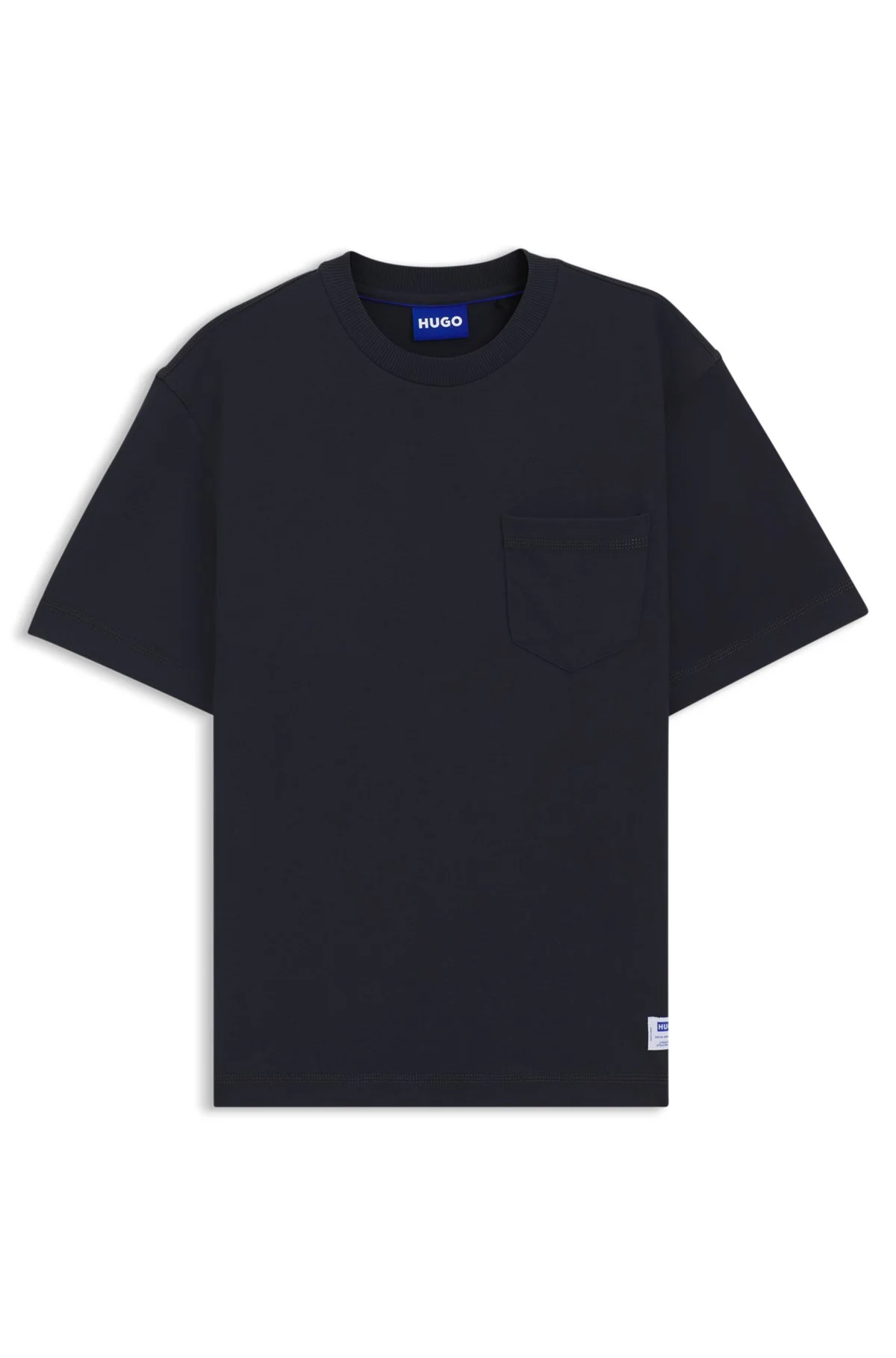 SIZE AND FIT Regular fit The model wears a size M and is 6'2" tall with a, 35" chest, 27" waist and 35" hips. DETAILS Trimmed with a logo label and chest pocket, this HUGO Menswear T-shirt is cut in with a weighty drape. Straight fit. Regular fit Neckline: Crew neck Short sleeves Standard length Nestite - 50549108 QUALITY & CARE INSTRUCTIONS Do Not Tumble Dry Material: 100% Cotton, Collar: 95% Cotton, 5% Elastane Reduced Dry Clean Iron Low Heat Machine Wash Cold Gentle Do Not Bleach