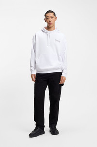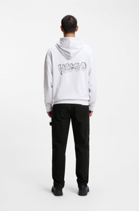 SIZE AND FIT The model wears a size M and is 6'2" tall with a, 34" chest, 29" waist and 35" hips. DETAILS Printed front and back with chrome-effect HUGO Menswear logos, this hoodie is a modern way to layer. Loose fit in cotton terry. loose fit Neckline: Hooded Fastening top: Slip-on Pockets top: Kangaroo pocket Long sleeves Ribbed cuffs Standard length Nyrohood - 50549212 QUALITY & CARE INSTRUCTIONS Iron Low Heat Do Not Bleach Machine Wash Cold Gentle Do Not Tumble Dry Material: 100% Cotton Do Not Dry Clean
