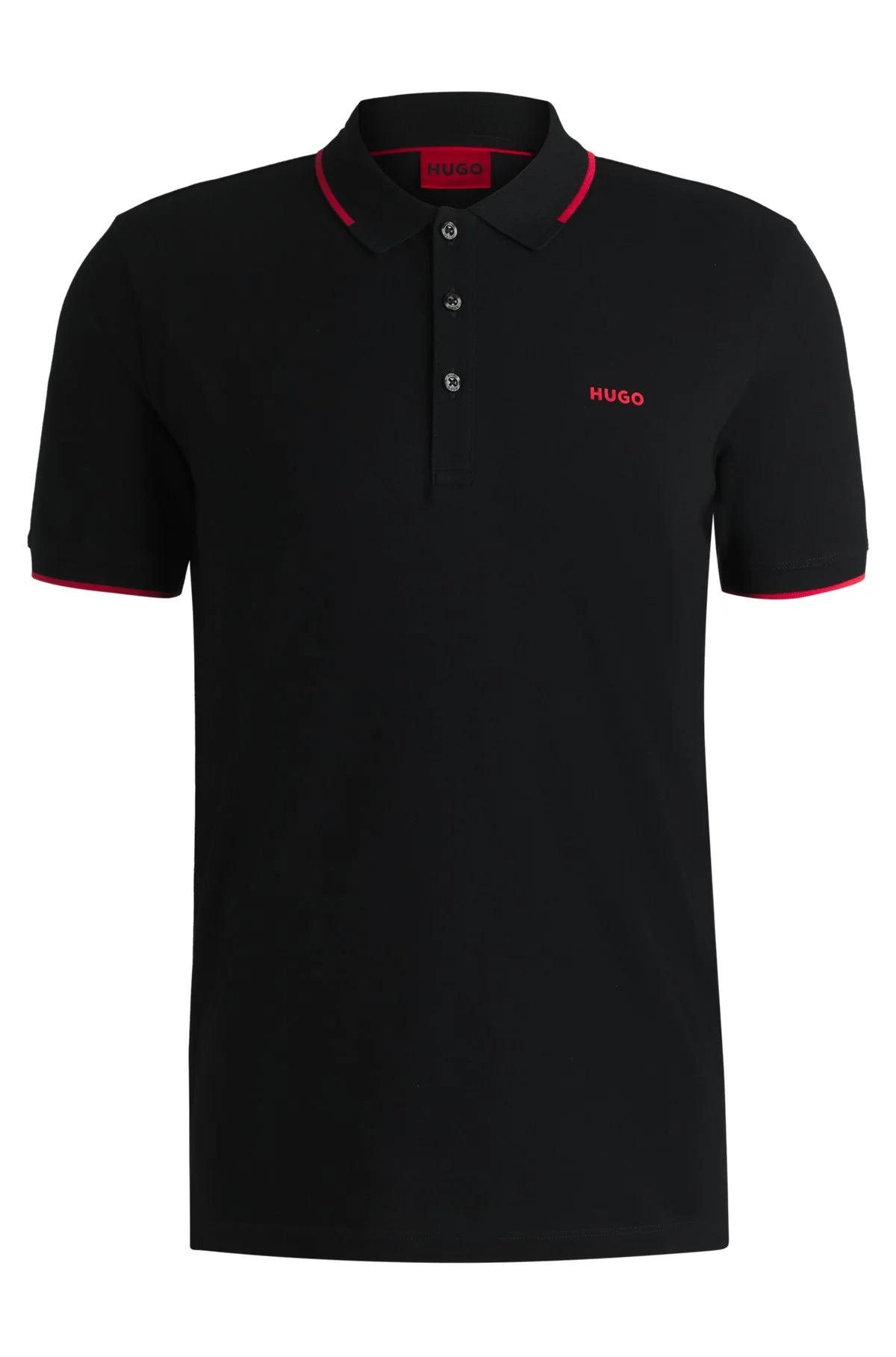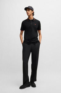 SIZE AND FIT The model wears a size L and is 6'3" tall with a, 35" chest, 31" waist and 35" hips. DETAILS Dinoso222 - 50467344 A slim-fitting polo shirt by HUGO Menswear, cut in stretch-cotton pique. Sporty style with a printed logo at the chest and contrast tipping. Slim fit Neckline: Flat-knit collar Number of buttons: 3 Flat-knit cuffs Standard length QUALITY & CARE INSTRUCTIONS Quality: 93% Cotton, 7% Elastane Iron Low Heat Machine Wash Cold Gentle Do Not Bleach Do Not Tumble Dry Do Not Dry Clean
