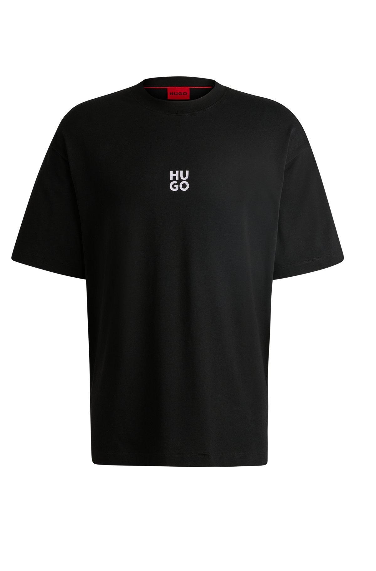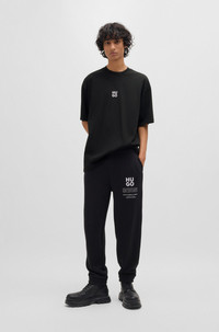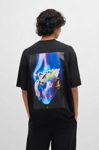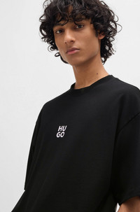 SIZE AND FIT The model wears a size M and is 6'2" tall with a, 33" chest, 29" waist and 35" hips. DETAILS Dflofire - 50521269 A short-sleeved T-shirt in an oversize fit by HUGO. Featuring a stacked-logo print and seasonal artwork, this top is crafted in cotton jersey. Oversized fit Neckline: Crew neck Short sleeves QUALITY & CARE INSTRUCTIONS Do Not Bleach Do Not Tumble Dry Quality: 100% Cotton Do Not Dry Clean Iron Low Heat Machine Wash Cold Gentle