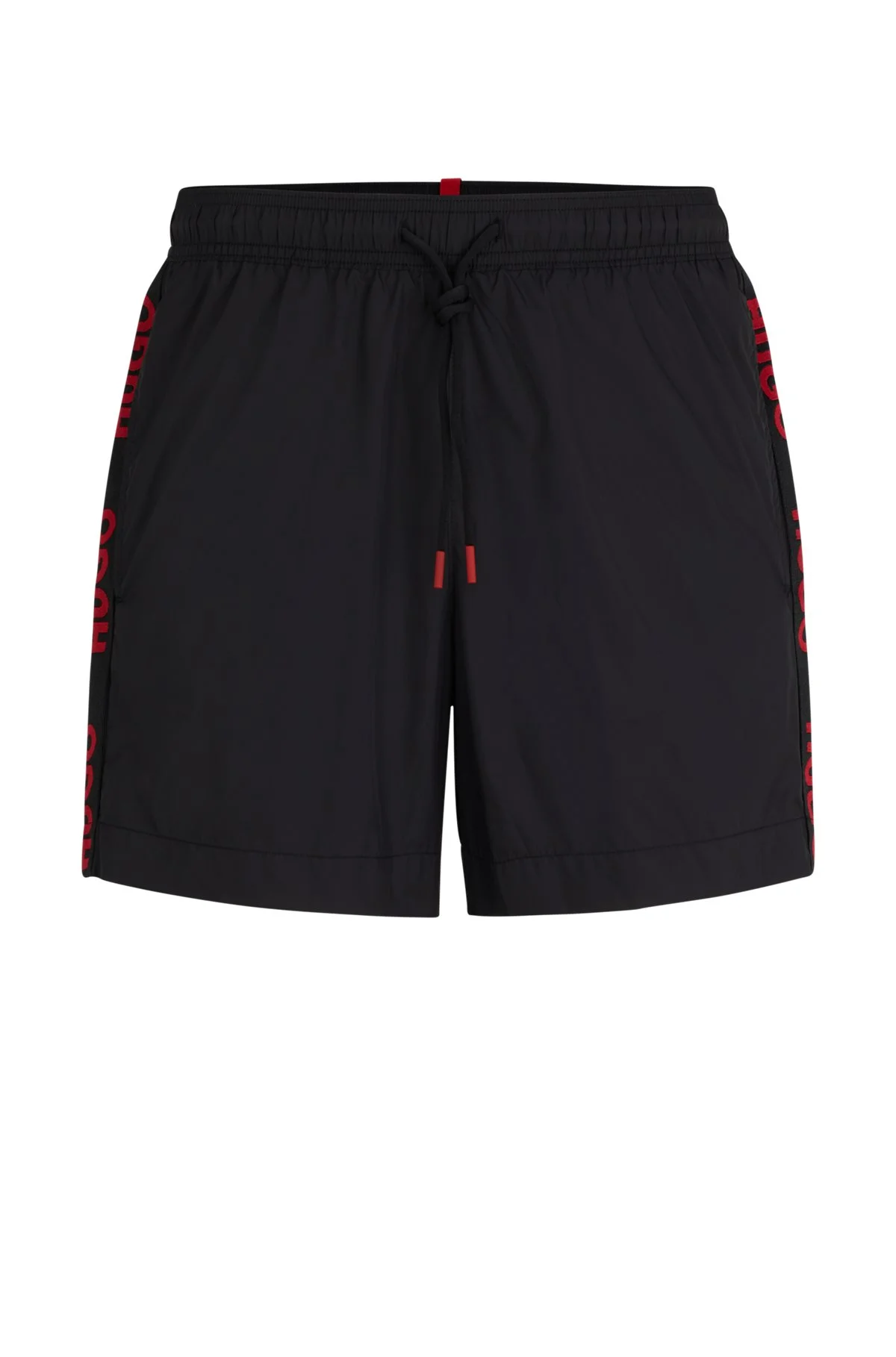 SIZE AND FIT The model wears a size M and is 6'0" tall with a, 34" chest, 27" waist and 36" hips. DETAILS FAB - 50500973 Signature swim shorts by HUGO. Featuring full lining, this sporty pair is trimmed with logo tape on the side seams. This product is created with polyamide made from pre- and post-consumer textile waste or industrial fishing nets. The aim of using materials is to save valuable resources. Elastic waistband Pockets bottom front: Side pockets Pockets bottom back: Patch pocket Medium length QUALITY & CARE INSTRUCTIONS Do Not Tumble Dry Machine Wash Cold Do Not Bleach Quality: 100% Polyamid, Lining: 100% Polyester, Inner lining: 100% Polyester Iron Low Heat Do Not Dry Clean