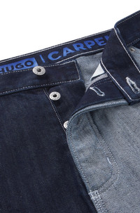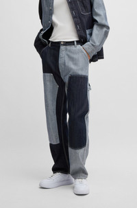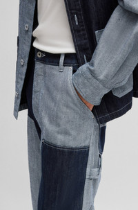 SIZE AND FIT The model wears a size 32/32 and is 6'2" tall with a, 35" chest, 27" waist and 35" hips. DETAILS Carpenter/2 - 50534051 Carpenter-style jeans in a loose fit by HUGO Menswear. This regular-rise, straight-leg pair features mixed denims for a color-blocked effect. loose fit Regular rise Button closure Pockets bottom front: Side slash pockets Straight leg Pockets bottom back: Patch pocket Standard length Fit foot width: 46,0 cm (18.1 inches) QUALITY & CARE INSTRUCTIONS Iron Medium Heat Quality: 100% Cotton, pocketing: 100% Cotton Do Not Tumble Dry Do Not Bleach Machine Wash Cold Gentle Do Not Dry Clean