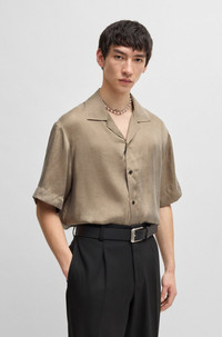 DETAILS Espino - 50539342 In drapey twill, this HUGO Menswear shirt is an effortless piece to add to your summer collection. Easy loose fit with a casual camp collar. Oversized fit Reverse lapels Short length Fit back length: 72 cm (28 inches) QUALITY & CARE INSTRUCTIONS Do Not Bleach Do Not Tumble Dry Hand Wash Only Quality: 60% Lyocell, 40% Viscose Do Not Dry Clean Iron Low Heat