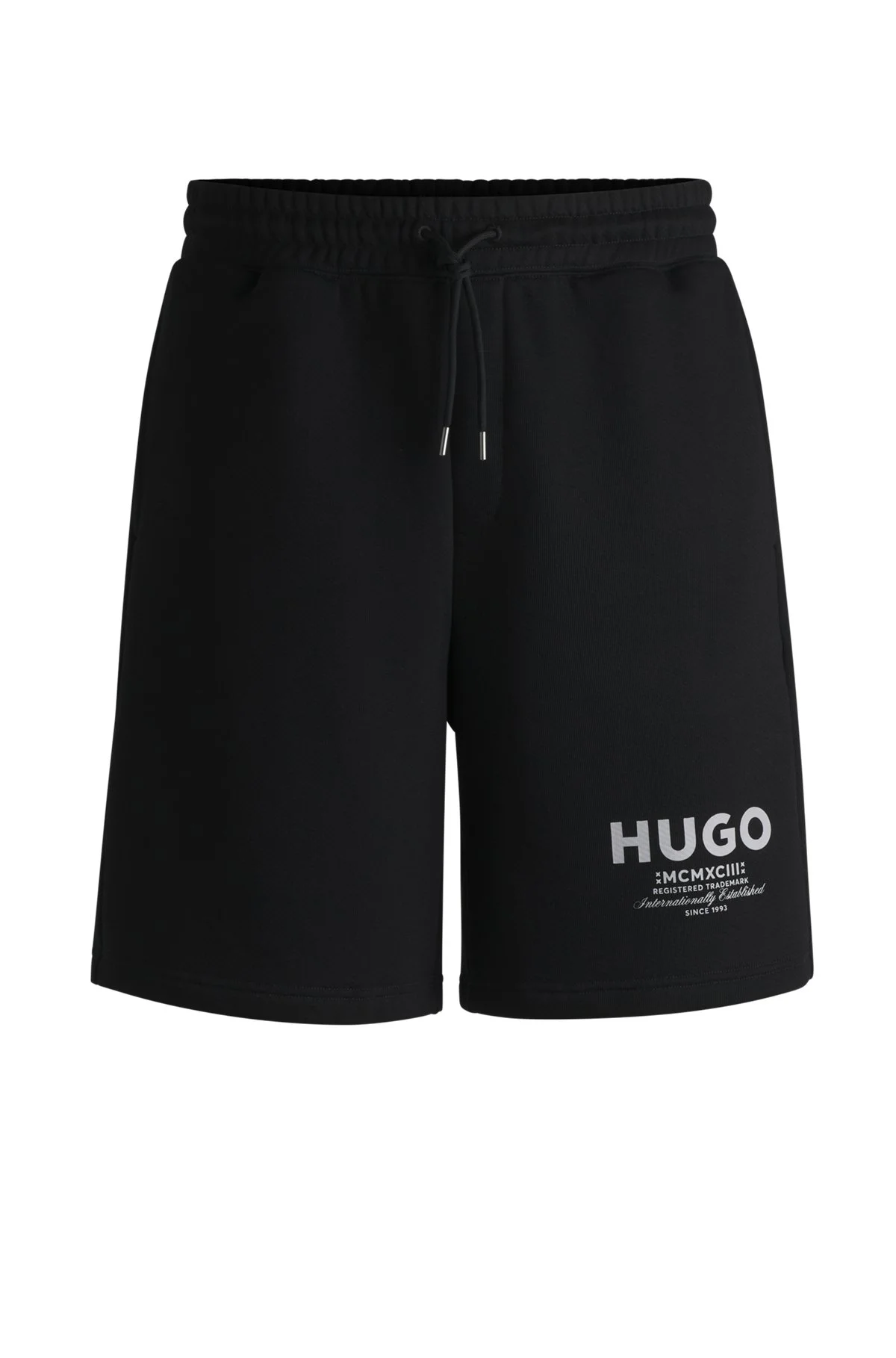 SIZE AND FIT The model wears a size M and is 6'2" tall with a, 31" chest, 26" waist and 35" hips. DETAILS Nomario - 50510728 Sporty shorts by HUGO Menswear, cut in French terry cotton with a weighty feel. Loose fit with elasticated drawstring waist. Blue logo print. loose fit Drawstring Pockets bottom front: Side pockets Pockets bottom back: Patch pocket QUALITY & CARE INSTRUCTIONS Iron Low Heat Machine Wash Cold Gentle Quality: 100% Cotton Do Not Bleach Do Not Tumble Dry Do Not Dry Clean