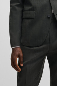 SIZE AND FIT The model wears a size 38R and is 6'1" tall with a, 33" chest, 27" waist and 36" hips. DETAILS Kris/Teagan233F1X - 50533278 A distinctive suit cut to a modern fit by HUGO Menswear. Blended with wool, this performance-stretch ensemble is woven with a dobby micro pattern. modern fit Notched lapels Fastening top: Button closure Number of buttons: 2 Welt chest pockets Pockets top: Flap pockets Inside patch pockets Button cuffs Back vent Fully lined Fit back length: 74 cm (29 inches) Hook and zip closure Pockets bottom front: French pocket Pockets bottom back: Welt pocket Fit foot width: 40,0 cm (15.7 inches) QUALITY & CARE INSTRUCTIONS Iron Low Heat Quality: 55% Polyester, 45% Virgin wool, Lining: 100% Polyester, Sleeve lining: 100% Polyester, pocketing: 65% Polyester, 35% Cotton, knee lining: 100% Viscose Do Not Wash Reduced Dry Clean Do Not Bleach Do Not Tumble Dry