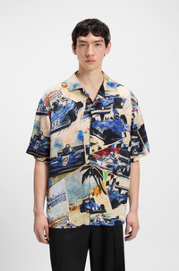 DETAILS Espino - 50534276 An oversize-fit shirt by HUGO Menswear. Featuring vintage racing artwork, this short-sleeved piece is crafted in fluent poplin. Oversized fit Reverse lapels Short length Fit back length: 72 cm (28 inches) QUALITY & CARE INSTRUCTIONS Quality: 100% Viscose Do Not Bleach Do Not Dry Clean Do Not Tumble Dry Machine Wash Cold Iron Low Heat