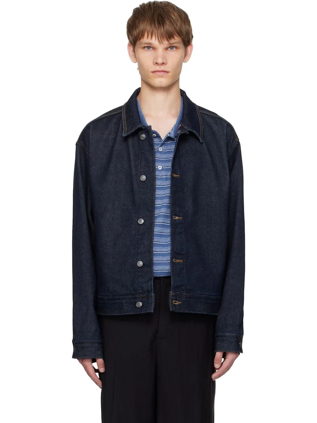 Non-stretch denim jacket. · Spread collar · Button closure · Welt pockets at waist · Buttoned barrel cuffs · Leather logo patch at back hem · Pleats and adjustable buttoned tabs · Logo-engraved silver-tone hardware · Contrast stitching in tan Supplier color: Dark blue 100% cotton. Made in Turkey 252084M177000