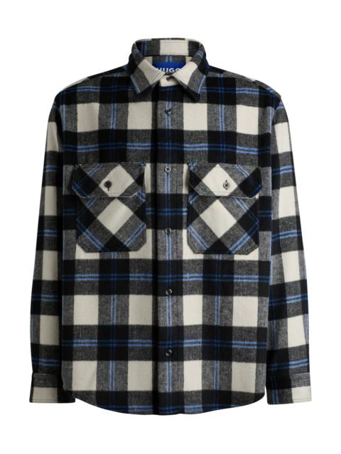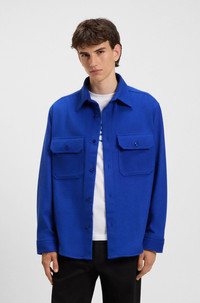 SIZE AND FIT The model wears a size M and is 6'2" tall with a, 37" chest, 29" waist and 37" hips. DETAILS A modern shirt with flap chest pockets by HUGO. Cut to a roomy fit, this piece is designed in brushed flannel blended with wool. Oversized fit Kentkragen Flap chest pockets Barrel cuffs Long length Fit back length: 81 cm (32 inches) Ebolt - 50527993 QUALITY & CARE INSTRUCTIONS Do Not Wash Do Not Bleach Quality: 78% Polyester, 19% Wool, 1% Viscose, 1% Polyacrylic, 1% Polyamid Iron Low Heat Dry Clean Only Do Not Tumble Dry